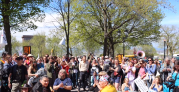 Des centaines de citoyens accueillent la Marche des peuples pour la Terre mère à Québec et manifestent contre les oléoducs transportant du pétrole issu des sables bitumineux