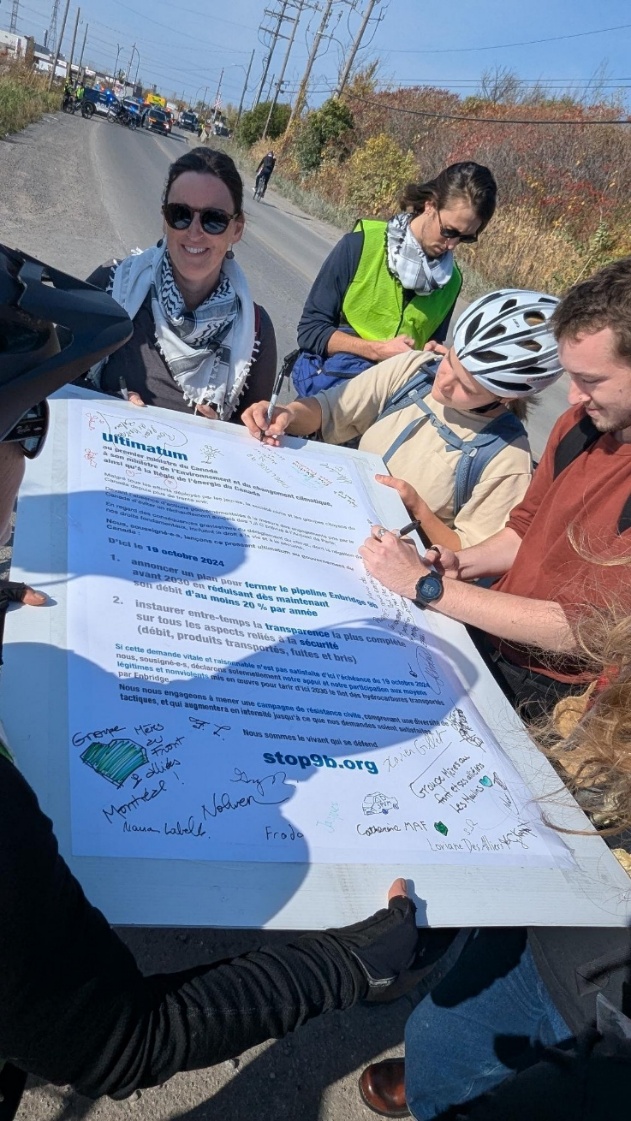 C’était aussi le deuxième anniversaire de l’ultimatum lancé par notre collectif, Le vivant se défend, au gouvernement fédéral et à Enbridge : fermer la ligne 9B d’ici 2030, réduire son débit chaque année et rendre publiques les fuites. Faute de quoi, chaque 19 octobre deviendra une journée d’action perturbatrice jusqu’en 2030.