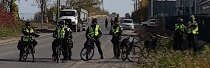 Deux cordons policiers devant nous au bureau d’Enbridge. Photo : Alain Mignault.