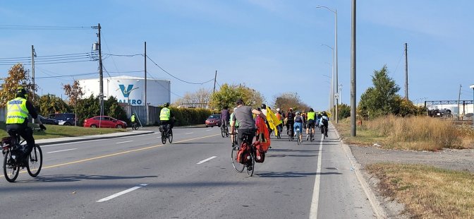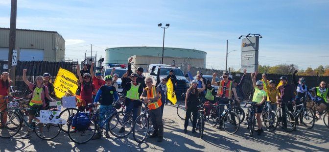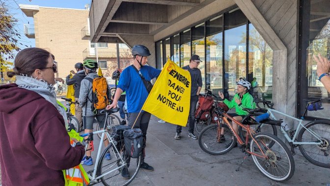 Puisque nous avions promis d’agir, nous avons choisi cette année d’organiser une masse critique à vélo pour aller livrer l’ultimatum à Enbridge, malgré une tension palpable.