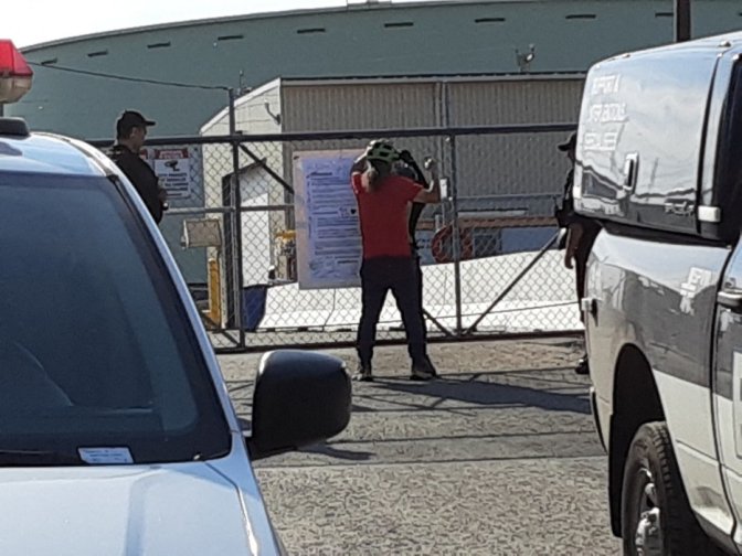 Alain Mignault explique que les policiers bloquent d’eux-mêmes l’entrée des camions citernes au terminal de Valéro sur la rue Marien. Photo : Anonyme.
