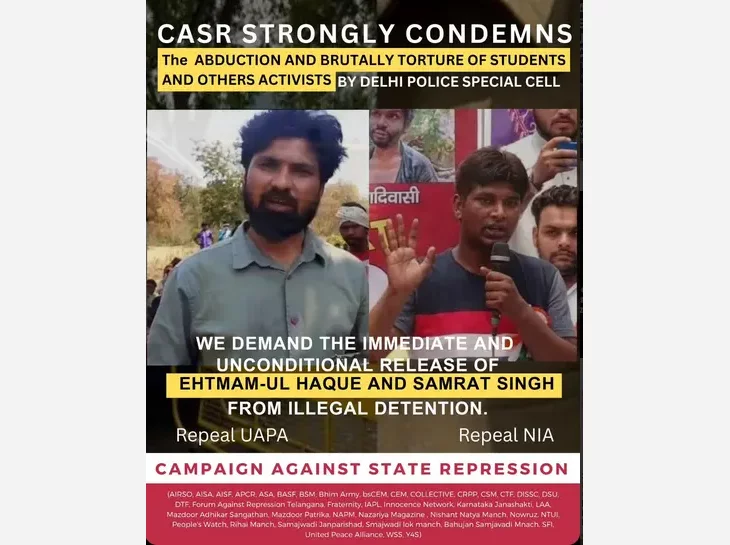 dans les 24 heures suivant leur arrestation comme l’exige la loi. La déclaration de la Campaign Against State Repression’s (CASR) souligne que pendant leur garde à vue, les militants ont été « déshabillés, battus, électrocutés et soumis à des traitements dégradants, notamment en se faisant plonger la tête dans des cuvettes de toilettes. La police a également proféré à leur endroit d’horribles menaces de violences sexuelles, en particulier à l’encontre des militantes, à qui l’on a dit qu’elles seraient violées à l’aide de bâtons ». On leur a demandé de signer des documents vierges et nous pouvons supposer que ceux-ci pourraient éventuellement être utilisés contre eux ou pour incriminer d’autres militants. Ils ont ensuite été libérés les uns après les autres vers le 18 juillet 2025, mais le 19 juillet, on a appris une nouvelle disparition, celle de Rudra, étudiant au Zakir Hussain College de l’université de Delhi.