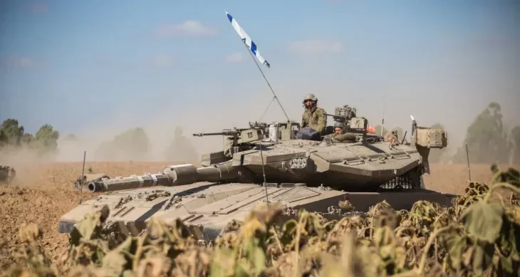 Tiré de Association France Palestine Solidarité. Photo : Un char de l’armée israélienne pénétrant dans la bande de Gaza lors d’une offensive contre l’enclave, 18 juillet 2014 © Yotam Ronen / Activestills. Publié par The New Arab.