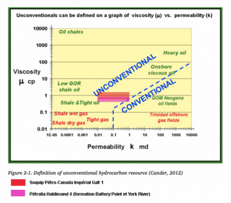 Levons d’abord le voile sur le concept de gisement conventionnel. Les travaux de Harris Cander, directeur du groupe de recherche sur le non-conventionnel à l’Association Américaine des Géologues Pétrolifères, l’AAPG, ont permis d’offrir des mesures quantitatives du concept. On peut parler d’un gisement conventionnel si la roche-mère est suffisamment perméable pour laisser s’écouler librement les hydrocarbures, en fonction de leur viscosité. Dans une formation géologique de gaz ou de pétrole de schiste, à gauche dans le graphique ci-dessous, l’industrie a recours à la fracturation pour extraire des hydrocarbures. Dans le cas d’hydrocarbures très visqueux, situés dans le haut du graphique, impossible de les faire couler sans les fluidifier, par l’injection de vapeur par exemple. Un peu comme chauffer du miel pour qu’il coule du pot. Pour un gisement qui se trouve en haut à gauche du graphique, l’industrie doit recourir aux deux techniques simultanément pour obtenir des débits commerciaux.