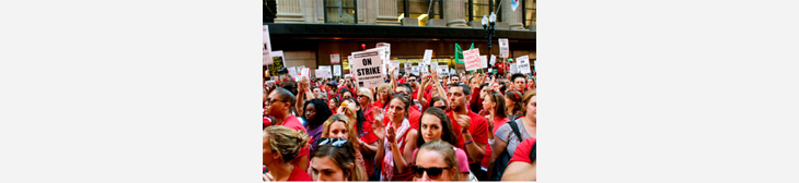 L’ampleur et la dynamique de la mobilisation se sont concrétisées, le jeudi 13 septembre, lors de l’imposant rassemblement de quelque 30’000 personnes, devant l’hôtel Hyatt. Le choix de ce lieu avait pour but de souligner la composition sociale du Conseil de gestion du système scolaire. En effet, Penny Pritzker, héritière de la fortune du groupe hôtelier Hyatt, siège dans ce conseil. Or, cette firme, au travers d’un système complexe d’imposition et de financement, a reçu des millions de la ville pour des « projets de développement », sommes dont les écoles et les quartiers défavorisés auraient un besoin urgent.