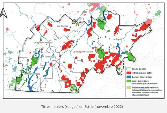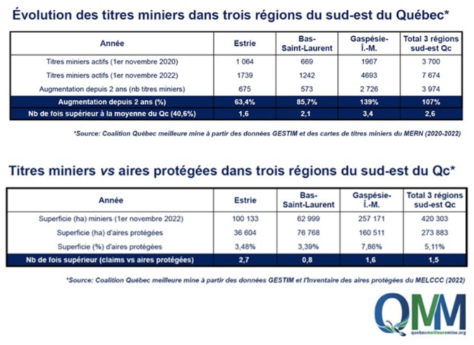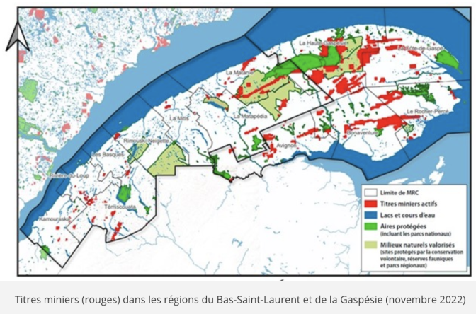 – Plus de 20 000 titres miniers dans le sud du Québec – On compte désormais plus de 20 000 titres miniers dans sept régions du sud du Québec, dont 7 674 titres miniers dans trois régions du sud-est du Québec en date de novembre 2022 : Estrie (1 739), Bas-Saint-Laurent (1 242) et Gaspésie-Îles-de-la-Madeleine (4 693). Plus de 15 000 titres miniers ont été répertoriés dans le sud-ouest du Québec en août 2022 (Laurentides, Lanaudière, Mauricie et Outaouais).