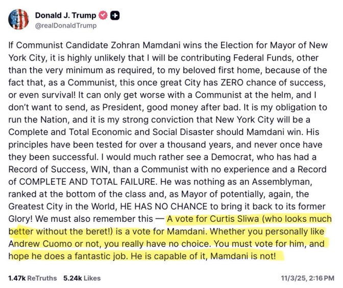 Aux démocrates, Trump promettait les foudres de son administration en cas de victoire de Mamdani : suppression de la contribution fédérale au budget de la ville et envoi de la garde nationale dans les rues de New York pour intimider les habitants. Musk a amplifié ce message sur son réseau social, ainsi que ceux des alliés de Donald Trump demandant à ce que Mamdani soit déchu de sa nationalité et expulsé en Ouganda.