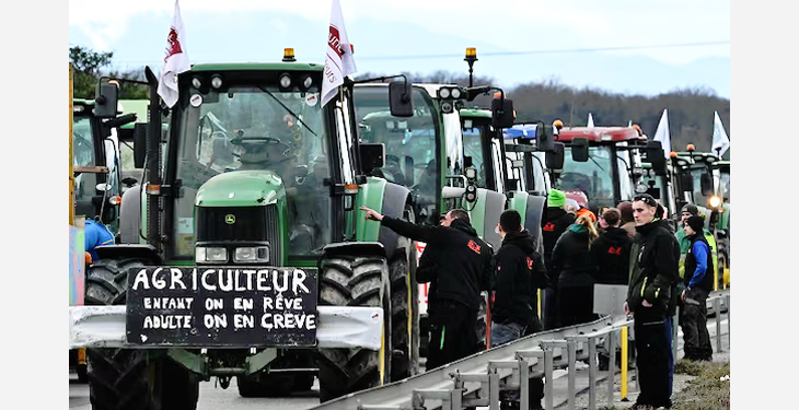 En France, la contestation s’est d’abord traduite par le retournement de panneaux routiers par des agriculteurs, pour protester contre la politique agricole de l’Union européenne. Depuis le 16 janvier, il y a des manifestations notamment en Occitanie pour des raisons multiples : crise sanitaire pour les éleveurs de bovins et retour de la grippe aviaire, viticulteurs confrontés à une surproduction et à une baisse de la consommation, sécheresses récurrentes et crainte face à la concurrence déloyale du fait de la multiplication des accords de libre-échange et des discussions concernant l’entrée de l’Ukraine dans l’UE. Hier, la mobilisation a tourné au drame avec la mort d’une agricultrice et de sa fille en Ariège.