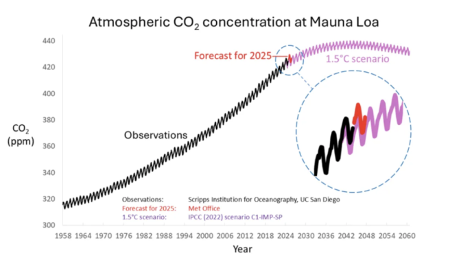 Graphique : Taux de CO2 dans l’atmosphère (courbe de Keeling). Graphique de 2023 du Meteorological Office du Royaume-Uni. Nous sommes en 2025 et aucun infléchissement de la courbe n’a eu lieu, la courbe continue de monter. Le zig-zag de la courbe est dû à l’alternance des saisons dans l’hémisphère Nord, qui a plus de masses continentales : en été la végétation est abondante et absorbe beaucoup de CO2, en hiver beaucoup moins. [31]