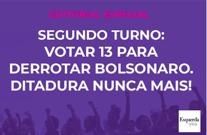 Nous sommes le PSOL et nous construisons une stratégie socialiste et révolutionnaire pour le Brésil. Nous voterons Haddad (PT) le 28 octobre afin de vaincre Bolsonaro. Nous mènerons une forte campagne dans la rue, sans compter nos efforts, en dialoguant avec les travailleurs et travailleuses, avec les jeunes et les opprimé·e·s, non seulement pour empêcher la victoire de l’extrême droite néofasciste, mais également pour préparer et construire les luttes urgentes de demain. (7 octobre 2018 ; éditorial publié sur le site Esquerda online ; traduction A l’Encontre)