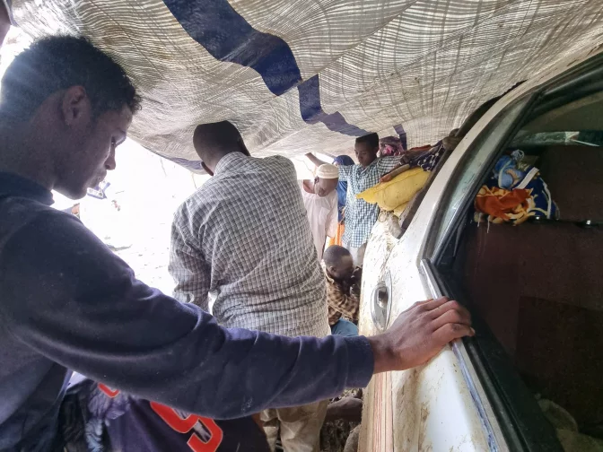 17 juin 2024. Dans une forêt près de la frontière entre le Soudan et le Soudan du Sud. Le photojournaliste soudanais Mohamed Zakaria tente de rejoindre le Soudan du Sud, puis l’Ouganda depuis El-Fasher. Sur la route, un pneu crève. La réparation se fait sous la pluie.