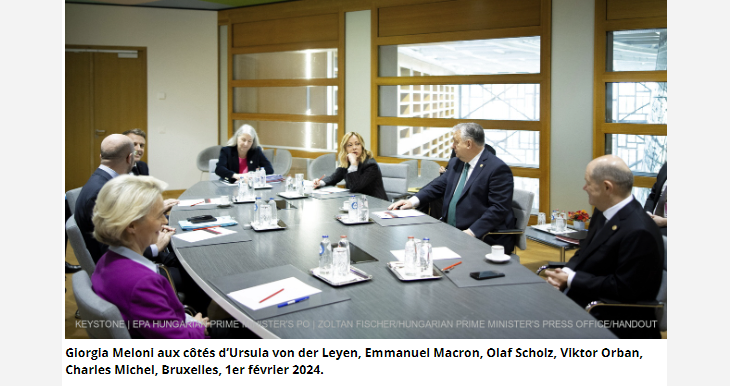 15 février 2024 | tiré du site alencontre.org | Photo : Giorgia Meloni aux côtés d’Ursula von der Leyen, Emmanuel Macron, Olaf Scholz, Viktor Orban, Charles Michel, Bruxelles, 1er février 2024.
