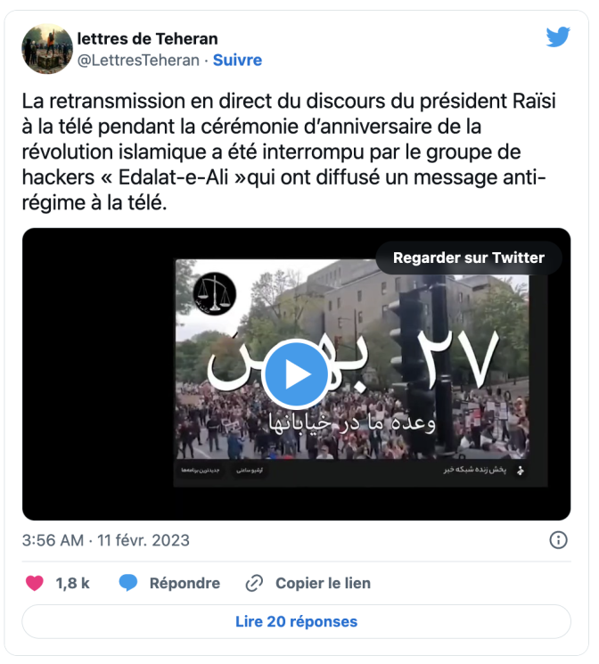 Ou c’est encore le piratage, pendant une quarantaine de secondes, samedi 11 février, de la télévision d’État, en pleine couverture de la cérémonie de l’anniversaire de la révolution de 1979, au moment même où le président Ebrahim Raïssi prononçait son discours. À l’instigation du groupe de hackers Edala’at Ali (la justice d’Ali), il a donné lieu à la diffusion de slogans anti-régime – « Mort à Khamenei, mort à la République islamique ! » et d’images dénonçant la répression.