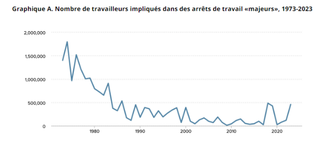 Source : Bureau of Labor Statistics : Bureau of Labor Statistics, « Work Stoppages Summary » (communiqué de presse), 21 février 2024, et tableau connexe, « Annual Work Stoppages Involving 1,000 or More Workers, 1947-Present ».