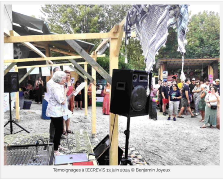 Ce vendredi 13 juin en fin d’après-midi, la chaleur étouffante, ayant allègrement dépassée les 30°c toute la journée, ne s’est pas encore estompée. Cela n’empêche pas les bénévoles de s’agiter tous azimuts dans les jardins de l’ECREVIS[1], le fameux tiers-lieu de Meythet, en périphérie d’Annecy, afin que tout soit prêt. Au menu ce soir, concerts de rap et d’électro engagés, entrecoupés de témoignages en provenance de Gaza, l’ensemble des fonds récoltés devant aller aux associations locales soutenant la cause palestinienne. Des membres des associations ITHAR 74[2] et AFPS Annecy[3] tiennent d’ailleurs des stands à proximité du bar, leur garantissant une certaine fréquentation tout au long de la soirée.