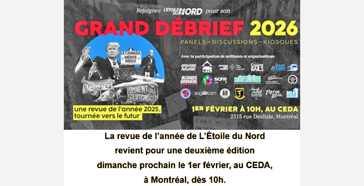 Au fil de la journée, nos journalistes animeront des panels avec des personnes directement impliquées dans les luttes de 2025, suivis de discussions en sous-groupes, orientées vers l’année 2026. Les différentes organisations et militants provenant des syndicats et des mouvements sociaux auront donc l’occasion de partager leurs apprentissages de 2025 et de se préparer pour l’année 2026 qui commence. La journée se terminera par un 5 à 7, pour continuer les échanges de façon plus informelle.