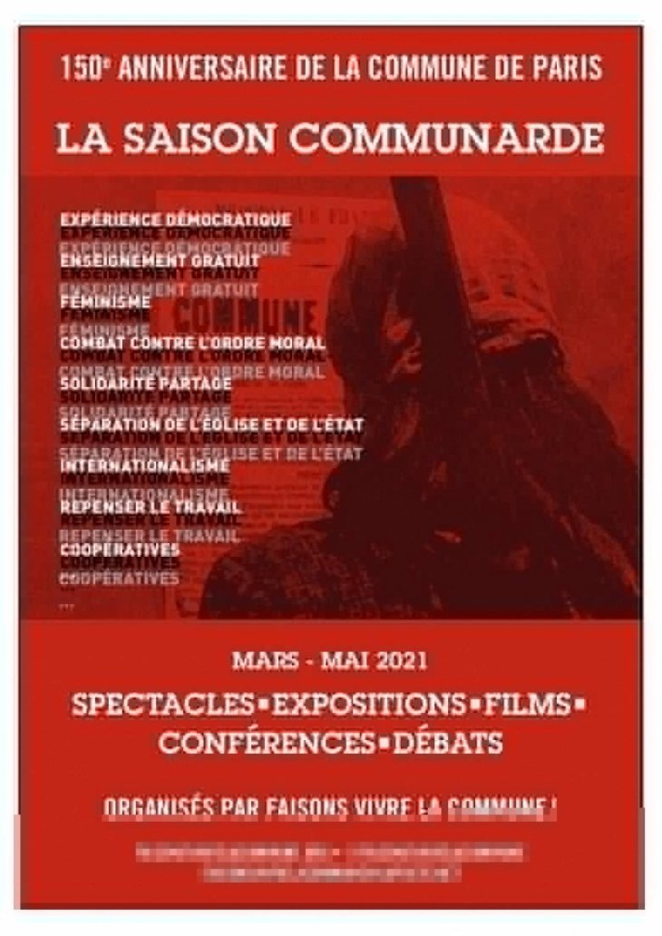 Nous avons désormais l’assurance – si les conditions sanitaires du printemps le permettent – de présenter quatre expositions et de proposer près d’une trentaine de débats et tables rondes. Plusieurs artistes plasticiens pourront également intervenir ponctuellement à différentes occasions. Tout cela grâce à des partenariats développés avec la mairie du 20e arrondissement, d’une part, et d’une petite dizaine de lieux alternatifs, implantés pour l’essentiel dans le nord et l’est parisien, d’autre part. La programmation cinéma (près de 30 films et documentaires, courts ou longs métrages) sera, de son côté, projetée – débats à l’appui – au cinéma La Clef, dans le 5e arrondissement, actuellement occupé par le collectif « Home Cinéma ». Toute cette programmation est développée dans le cahier intérieur du n° 7 de Actualité(s) de la Commune [1].