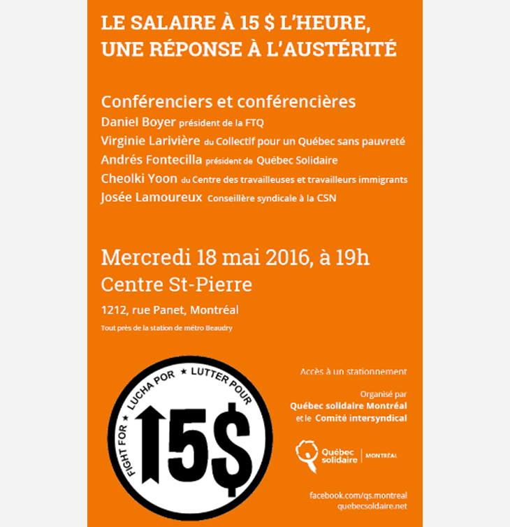 L’activité sur le salaire minimum à 15 $ fait partie des moyens pour contrer l’austérité et les défenseurs de cette idéologie qui exigent que les pauvres deviennent plus pauvres.
