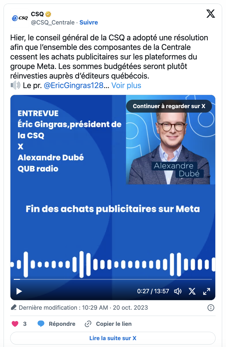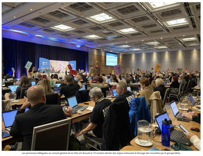 Pour la Centrale, bien que la loi canadienne pourrait être bonifiée pour répondre aux préoccupations de l’industrie, elle ne justifie en aucun cas le blocage décrété par le groupe Meta. Selon Éric Gingras, « l’attitude du groupe Meta par rapport aux créateurs de contenu que sont les médias nécessite une mobilisation collective à laquelle la CSQ souhaite participer à sa façon ».