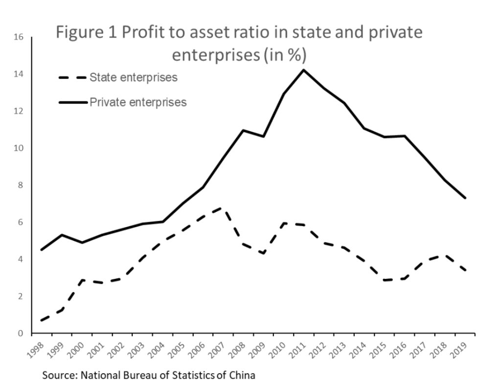 Suivant des sentiers bien tracés, la plupart de ces dettes ont servi à financer de nouveaux immeubles, des usines de charbon, des aciéries et des projets d’infrastructure. Comme il n’y avait pas grand monde pour consommer leur production finale, les nouveaux investissements n’ont fait que générer de nouvelles capacités excédentaires non rentables. Après le rebond de 2009-2010, la rentabilité des entreprises a continué de chuter dans tous les secteurs, tant privés qu’étatiques, comme le montre le graphique 1 ci-dessous.