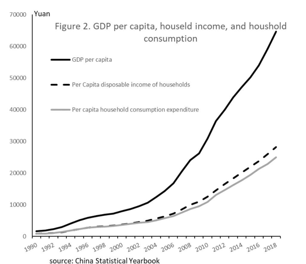 La chute des bénéfices ajoute une dimension urgente au problème de la surcapacité endettée. Les bénéfices fournissent aux entreprises les liquidités nécessaires au service de leurs dettes et au remboursement de leurs emprunts. En Chine, la baisse des bénéfices a créé une bombe à retardement de la dette : que se passerait-il lorsque les défauts de paiement commenceront ? Les responsables économiques du PCC n’avaient plus de marge de manœuvre pour stimuler les investissements financés par la dette. Pendant ce temps, la croissance du secteur des exportations restait inférieure aux niveaux d’avant 2008. A la recherche d’un nouveau moteur d’expansion, Pékin a appelé à délaisser les investissements fixes au profit de la consommation intérieure privée. Le volume de la consommation privée a effectivement augmenté rapidement après l’adhésion de la Chine à l’OMC (Organisation mondiale du commerce) en 2001, mais il n’a jamais progressé assez vite pour rattraper l’expansion de l’investissement (voir le graphique 2 ci-dessous). La croissance décevante de la part de la consommation est le résultat de la hausse des inégalités. Tout au long du long boom des exportations, le revenu moyen des ménages a augmenté beaucoup plus lentement que l’économie dans son ensemble. Cela signifie que la plupart des nouveaux revenus générés par l’économie sont allés au gouvernement et à d’autres entreprises, au lieu d’être versés aux employé·e·s sous forme de salaires et de rémunérations. Au lieu d’augmenter la consommation, l’excédent a été réinjecté dans l’investissement et dans de nouvelles capacités excédentaires.