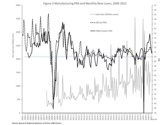 Graphiques 3. Indice des achats manufacturiers et nouveaux crédits mensuels 2005-2021