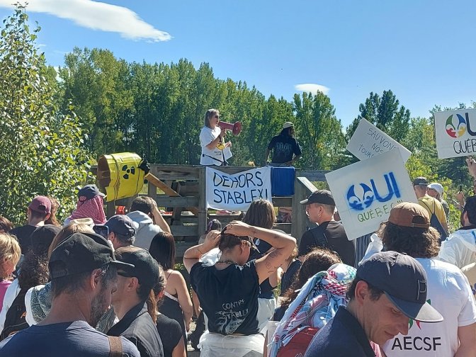 Nous ne souhaitons pas déplacer le problème ailleurs. Nous souhaitons voir se multiplier les résistances locales. Que vous soyez face au Golfe, ou le long des rives du Saint-Laurent, dans les forêts de l’Abitibi et du Nitaskinan ou dans les cantons de l’Est, vous êtes conviés à vous joindre aux Soulèvements du fleuve et aux habitants