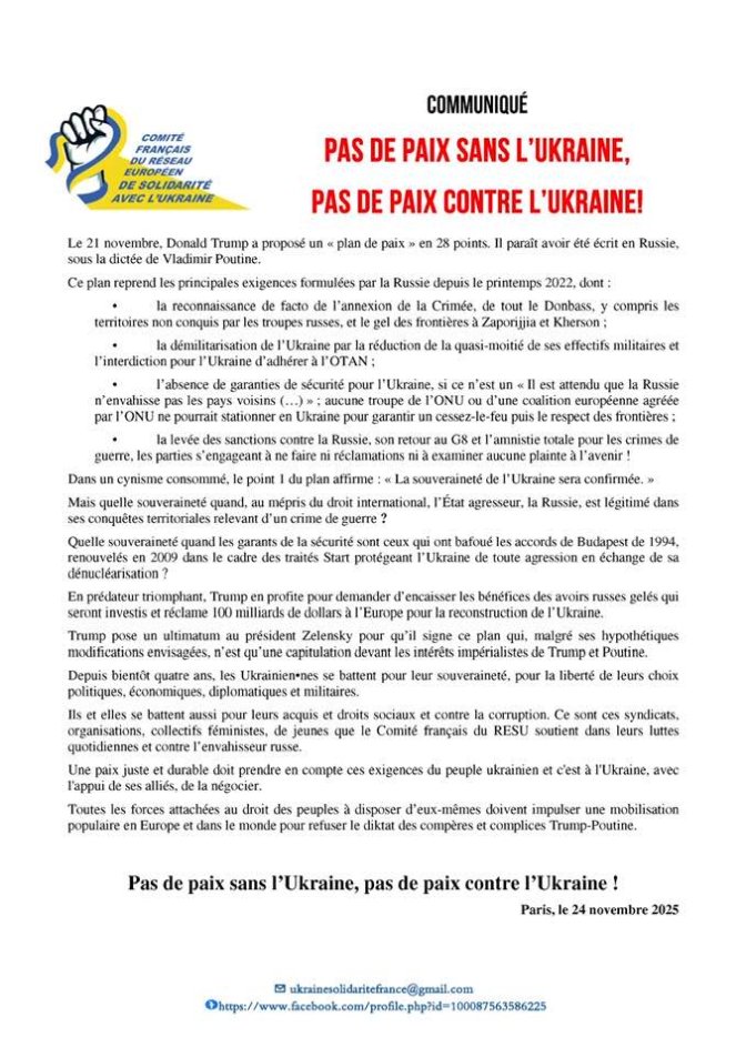 Trump pose un ultimatum au président Zelensky pour qu’il signe ce plan qui, malgré ses hypothétiques modifications envisagées, n’est qu’une capitulation devant les intérêts impérialistes de Trump et Poutine.