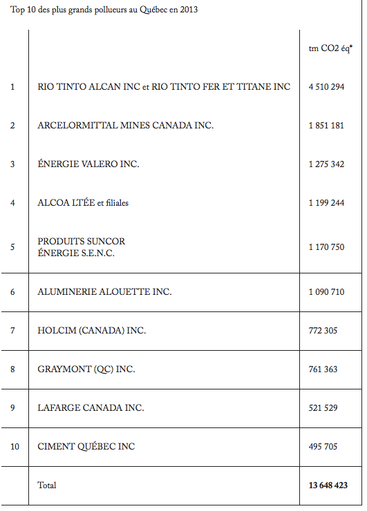 On le remarquera sans surprise, les entreprises les plus polluantes opérant au Québec sont les alumineries, les mines, les cimenteries et les raffineries. En se basant sur les données de 2012 (p. 11), on peut calculer que ces 10 entreprises représentent près de 55,5 % des émissions de l’ensemble du secteur industriel au Québec et 21,3 % des émanations totales du territoire. À elles seules, ces 10 entreprises polluent près de 2 fois plus que l’ensemble du secteur résidentiel, commercial et institutionnel. Le grand champion, Rio Tinto et ses filiales, émet plus de GES que l’ensemble des activités de gestion des déchets pour l’ensemble de la province, ce qui n’est pas peu dire.