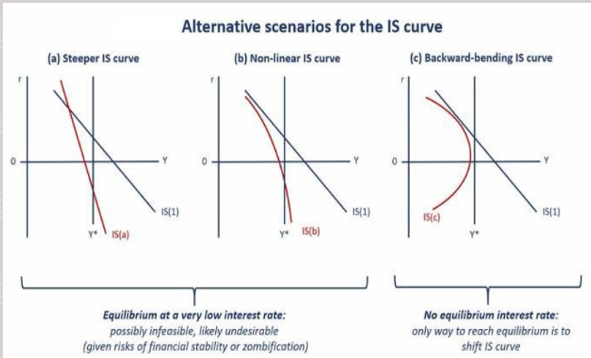 Cette situation préoccupe Lawrence Summers, l’un des théoriciens de la stagnation séculaire. Il vient de publier, avec Anna Stansbury, une tribune [3] qui reprend un fil sur twitter [4], où il s’inquiète du « peu de marge » qu’il reste aux banques centrales pour des baisses de taux d’intérêt. Cette préoccupation a d’ailleurs été au centre de la dernière réunion annuelle de Jackson Hole [5], où les banquiers centraux se penchaient sur les défis de la politique monétaire. Summers parle du « trou noir monétaire » dans lequel l’Europe et le Japon seraient déjà plongés. Dans son tweet, il va même plus loin en avançant l’idée que dans certains cas, la baisse des taux d’intérêt pourrait réduire la demande globale. Pour illustrer son propos, il présente un diagramme du modèle canonique IS-LM « avec une courbe IS très pentue, non linéaire, ou même courbée vers l’arrière ».