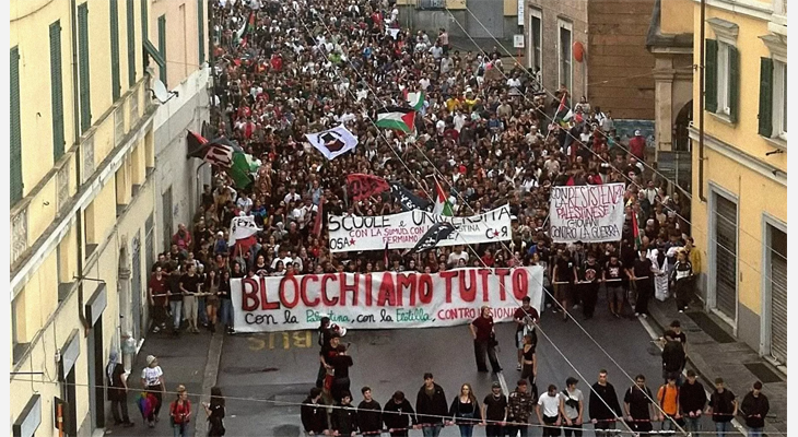 Ces paroles, prononcées par des dockers du port de Gênes, défiaient directement Israël qui interdit toute voie d’accès à la bande de Gaza. La désobéissance civile des dockers de Gênes s’est ensuite étendue à d’autres ports italiens. Au cours des deux dernières années, le transit de plusieurs cargaisons avait déjà été bloqué à Gênes, Salerne, Livourne et Ravenne, mais sans prendre l’ampleur attendue ni recevoir de soutien massif des partis ou organisations. Le 18 septembre, à Ravenne, sur la côte adriatique, dockers et associations pacifistes ont fini par convaincre le maire de centre gauche Alessandro Barattoni de bloquer deux containers d’explosifs à destination d’Israël.