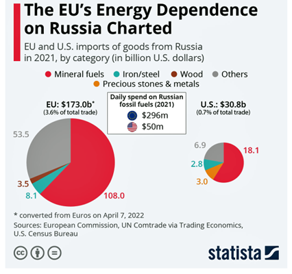 Selon les chiffres de la Commission européenne et base de données UN Comtrade et du U.S. Census Bureau ; la valeur des importations en combustibles fossiles acheminée par la Russie vers Europe était de 296 millions de dollars au moment du déclenchement du conflit. La crise énergétique touche particulièrement le gaz. Le gaz russe est le combustible fossile le plus difficile à remplacer pour l’Union européenne. Il est acheminé et distribué sur le continent par des gazoducs et provient souvent de puits conventionnels peu coûteux à exploiter. De plus, plusieurs pays manquent encore d’infrastructures pour recevoir le GNL importé des producteurs dont les États-Unis. La dépendance envers ce combustible de la Russie est donc solidement ancrée, plusieurs pays s’approvisionnant en grande partie en gaz auprès de leurs voisins d’Europe de l’Est. La guerre en Ukraine a rapidement imposé le retrait d’une grande partie du gaz de la Russie du marché européen.