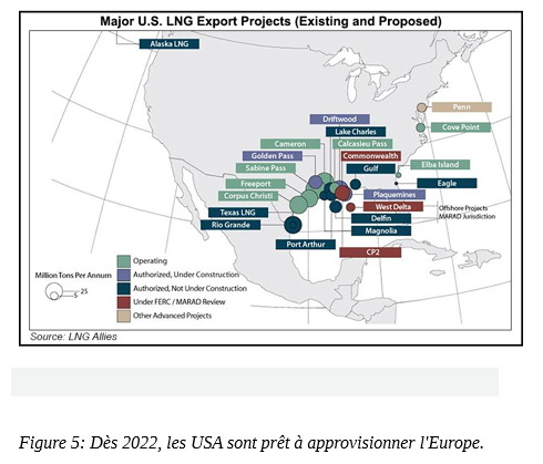 Cette situation explique bien la course effrénée aux pipelines et aux projets de liquéfaction du gaz que nous vivons depuis la dernière décennie en Amérique du Nord. Ainsi en ce qui a trait à l’exportation du gaz de schiste, les États-Unis sont le théâtre d’une mobilisation de ressources massive vers l’exportation, et la compétition n’est pas la bienvenue. On a assisté au cours de récentes années à des investissements de milliards dans des usines de liquéfaction pour l’exportation. Plusieurs de ces usines entraient en fonction au début du conflit. Deux imposants projets sont entrés en fonction depuis le début de la guerre en Ukraine.