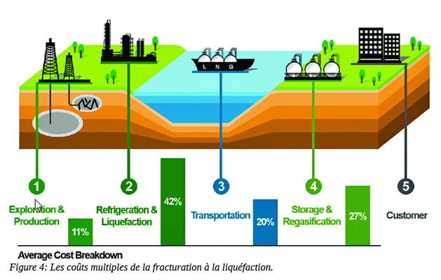 On a donc poussé plus loin le désir d’autonomie énergétique issue du miracle gazier. La grande puissance économique mondiale américaine a concocté une nouvelle politiques d’exportation. Son objectif, la conquête de nouveaux marchés gaziers afin de maintenir l’industrie nord américaine à flot ! Cette nouvelle politique de soutien à la production et à l’exportation du gaz a tôt fait de générer un surplus de capacité dans le marché mondial du GNL dès les années 2010. La baisse des cours mondiaux générée les années suivantes a transformer ce marché énergétique surtout en Europe en un marché d’acheteurs. Cette réalité a mené les analystes à croire encore plus à l’éventuel effondrement de l’industrie du trop coûteux gaz de schiste nord américaine. Sans le soutien massif du gouvernement américain, la production de gaz aux États-Unis chuterait, entraînant une forte hausse des importations de gaz. Cela a conduit la Maison Blanche à des investissements massifs dans la capacité de « regazage » du GNL en cas d’effondrement de l’industrie et d’une nécessité d’importation. La puissance américaine était face à des pertes dans les centaines de milliards si des avenues de vente dans de nouveaux marchés, ne se pointaient pas à l’horizon.