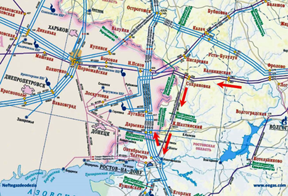 Ce fait explique les investissements massifs de Gazprom depuis 2012 dans la construction de très coûteux gazoducs maritimes contournant l’Ukraine. On ne peut que noter une certaine synchronicité entre l’agression armée actuelle et la fin des ententes gazières. Peut-on se surprendre de voir la Russie miser massivement ses ressources économiques sur des projets de gazoducs sous-marins des le tournant des années 2000 afin d’avoir la capacité autonome de contourner le territoire ukrainien ? Un simple coup d’oeil à une carte du réseau ukrainien publiée par la société russe Gazprom donne une excellente idée de l’importance des infrastructures industrielles en jeux dans la région est de l’Ukraine.