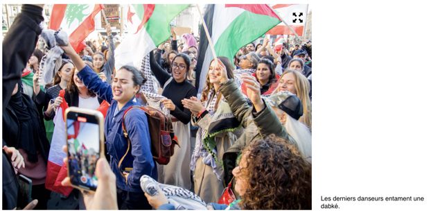 Sur un trottoir pas loin, trois femmes de trois générations différentes se sont arrêtées pour prendre en photo un graffiti en soutien aux Gazaouis. Lila est venue avec sa mère Yamina et sa fille Kamir. « À la base, on faisait juste des achats, et on est tombé sur la manifestation, alors on est venues se joindre. C’est une cause qui nous tient à cœur », explique Lila avec sincérité. « Bien qu’on soit conscientes que notre présence ici ne va rien changer », s’empresse-t-elle d’ajouter, comme pour s’excuser d’y avoir cru. La durée de la colonisation les laisse toutes trois désemparées. « On a l’impression que malgré tout ce qui se passe depuis des années, rien ne change. Que les mobilisations à travers le monde ne comptent pas », se lamente Lila. Kamir, à peine sortie de l’adolescence, se sent déjà découragée. « C’est triste de voir qu’un gouvernement peut agir ainsi sans que le monde entier ne réagisse. On se sent démunis, on a l’impression de n’avoir aucun moyen de faire bouger les choses. » La grand-mère opine, mais son regard exprime la fierté d’être là, malgré tout.