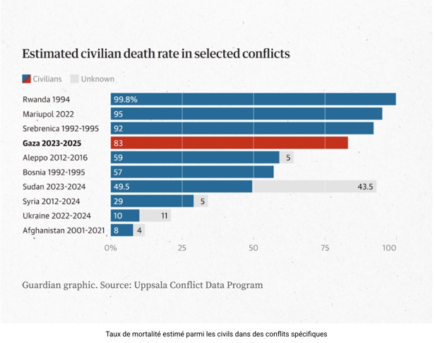 Selon les experts, cette politique de tir et la culture de vengeance qui s’est développée après le 7 octobre ont entraîné un taux de victimes civiles à Gaza extrêmement élevé pour une guerre moderne, même comparé à des conflits connus pour leurs tueries aveugles, tels que les guerres civiles en Syrie et au Soudan.