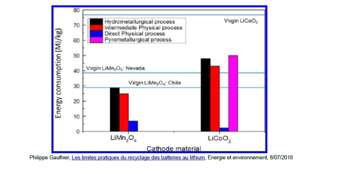 Mais ce recyclage n’est-il pas exactement ce qu’il faut faire pour sortir de l’extractivisme des hydrocarbures sans sombrer dans celui du lithium-cobalt-etc.? L’électrification réellement existante assise sur le remplacement des véhicules privés à essence par ceux hydroélectriques, promue tant par la CAQ-PQ-Libéraux que par la députée Solidaire porte-parole du parti en politique environnementale, est en train de générer une demande en croissance exponentielle qui n’en est qu’à ses débuts : « L’analyse de KPMG, réalisée pour le compte de Propulsion Québec, évaluait aussi que le nombre de véhicules électriques vendus en 2030 à travers le monde serait de 17 à 26 fois plus important qu’aujourd’hui » (MCI, La batterie au lithium peut donner au Québec un positionnement mondial enviable, 5/01/21). Inutile de dire que c’est l’extractivisme minier qui devra fournir l’essentiel des minéraux pour approvisionner batteries, panneaux solaires, éoliennes et tutti quanti d’ici l’atteinte du sommet de la courbe dans une vingtaine ou trentaine d’années soit le rythme trop lent du capitalisme vert, histoire de prendre le temps de rentabiliser la masse de capital investie dans les infrastructures d’hydrocarbures déjà existantes. Mais qu’en est-il du bilan environnemental réellement existant du recyclage des batteries ? Disons, pour le dire poliment, qu’il faut distinguer entre l’auto-évaluation des promoteurs et des gouvernements qui les soutiennent à la planche, trop souvent reprise presque sans critique par les grands médias, même leurs émissions scientifiques (Les années lumière, L’hydrométallurgie pour recycler les batteries usagées de voitures électriques, Radio-Canada, émission du 7/06/20) et les évaluations scientifiques trop rares de tiers partis et pas toujours facilement accessibles. De commenter le journal Libération : « Face à l’essor rapide des véhicules ’’propres’’, une filière européenne de recyclage des batteries lithium-ion se met en place, indispensable pour réduire l’empreinte écologique de ces dernières. Mais les processus actuels sont énergivores et leur efficacité encore limitée » (Sophie Kloetzil, Peut-on recycler les batteries des voitures électriques ?, Libération, 26/10/20). Selon Wikipédia : À partir de 2019, le recyclage des batteries Lithium-Ion dans la plupart des cas n’extrait pas de lithium car la technologie des batteries lithium-ion change continuellement et les processus de recyclage de ces batteries peuvent donc être obsolètes dans quelques années. Une autre raison pour laquelle cela ne se fait pas à grande échelle est que l’extraction du lithium à partir de vieilles batteries coûte cinq fois plus cher que le lithium extrait. Cependant, cela se fait déjà à petite échelle (par certaines entreprises, une industrie en attente de grandes quantités de batteries désaffectées à venir. (Wikipédia, Battery recycling, visité le 7/02/21,ma traduction) L’émission « Les années lumières » et des articles promotionnels de AVÉQ présentent l’usine pilote de Recyclage Lithion comme étant efficace à 95% sans trop apparemment de pollution tant au niveau des GES que des rejets liquides en comparaison de l’extraction minière et du raffinage du minerai. On se dit qu’on peut difficilement faire pire qu’une mine-raffinerie. Pour la consommation énergétique, l’information reste plus discrète. Le graphique ci-contre tiré du site web du blogueur et vulgarisateur Philippe Gauthier qui lui même le tire d’un article spécialisé, inaccessible au profane par internet, laisse voir que le processus de recyclage par hydrométallurgie, celui de Recyclage Lithion, est relativement énergivore (deux barres de gauche en noir par rapport aux trois lignes horizontales indiquant la consommation énergique unitaire pour trois mines). Il faudrait une évaluation scientifique objective que les acteurs concernés n’ont pas beaucoup d’intérêt à faire les uns pour des raisons d’accès aux fonds gouvernementaux qui semblent généreux et les seconds pour démontrer leur succès auprès de l’électorat. Ça ressemble à la dynamique de cercle vicieux de l’inexistant pétrole de fracking de l’Île d’Anticosti.