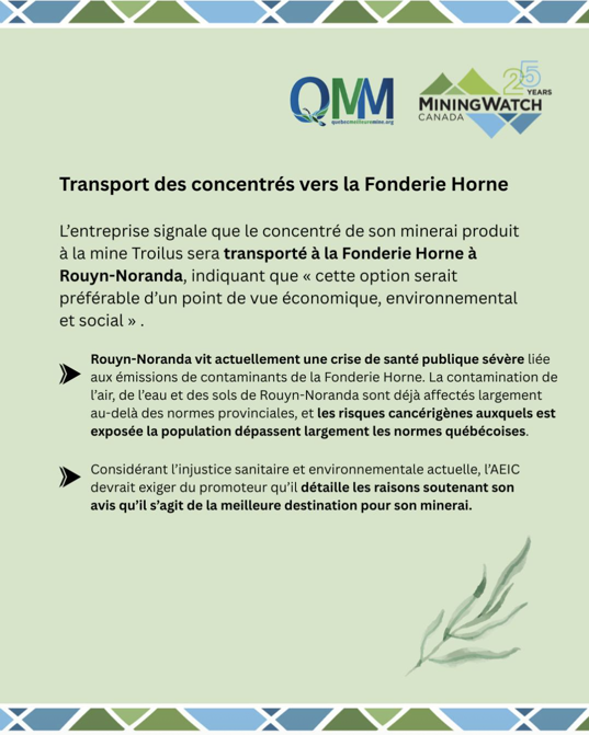 Les présents commentaires sont produits dans le cadre de l’évaluation du projet minier Troilus de la compagnie Troilus Gold en Eeyou Istchee dans le Nord-du-Québec devant l’Agence d’évaluation d’impact du Canada après concertation avec nos membres et partenaires intéressé·e·s à l’évaluation des impacts du projet. Plus particulièrement, nous demandons à l’Agence d’évaluation d’impact du Canada de ne pas autoriser le projet minier Troilus tel que soumis.