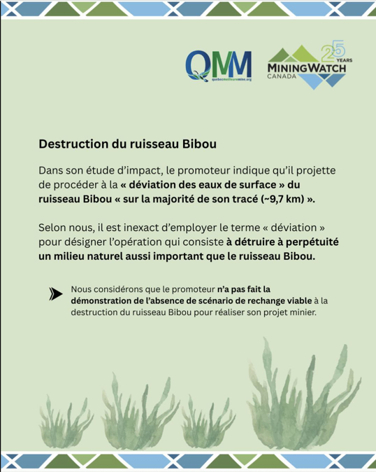 Nous réitérons que dans sa version actuelle, nous ne soutenons pas le développement du projet minier Troilus à l’étude en raison des biais méthodologiques induits dans son analyse des impacts cumulatifs dans la région, de son plan de destruction du ruisseau Bibou, du manque d’information concernant le transport du concentré vers la Fonderie Horne de Rouyn-Noranda, de l’absence d’engagement concernant la décontamination du passif minier local. Nous considérons que le promoteur n’a pas fait la démonstration de l’absence de scénario de rechange viable à la destruction du ruisseau Bibou pour réaliser son plan. Pour chacun de ces enjeux, nous avons soulevé que des renseignements et des études complémentaires sont nécessaires afin d’informer le public adéquatement des impacts du projet minier à l’étude.